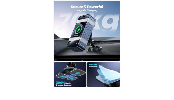 【15W Fast Magnetic Charging】The MagSafe car mount charger for iPhone features smart thermal management and large coils, allowing you to charge faster than standard wireless chargers. Just place your Phone against the magnet car mount, and it will automatically lock with the charging coil for up to 15W magnetic fast charging, making charging more stable,Protect Your iPhone\\\'s Battery Health.