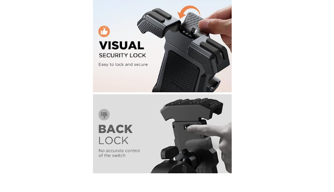 VISUAL SECURITY LOCK: Still bothered by the difficulty of finding the safety lock on the back of the motorcycle phone holder mount? OR the difficulty of locking the safety lock in place? JOYROOM visual locking mechanism phone mount for bike will brings you a new experience of simple locking and absolute security.