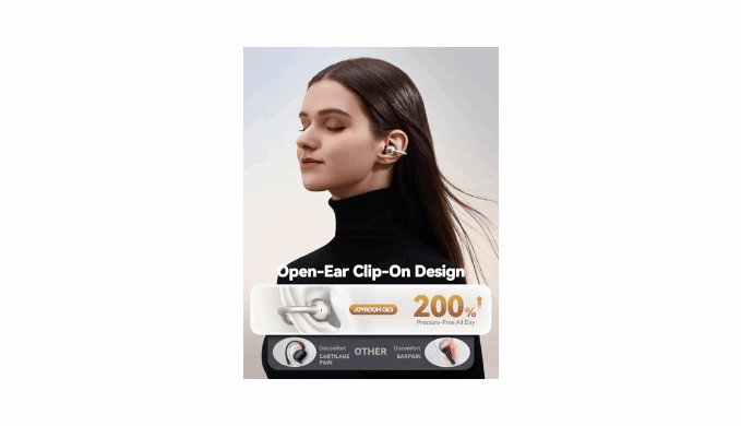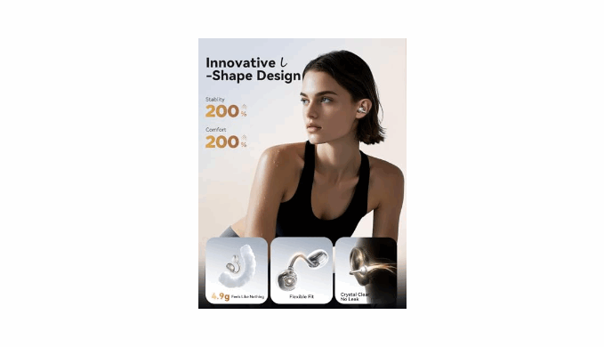【All-Day Comfort】Enjoy superior sound and lasting comfort with our L-shaped open ear clip on design. By positioning the bluetooth earbuds closer to the ear canal, they deliver clearer, more precise audio while minimizing sound leakage. The open-ear style ensures all-day comfort and keeps you aware of your surroundings—perfect for workouts or daily use. Crafted from high-elastic, skin-friendly silicone and weighing only 4.9g, these clip on earbuds offer a secure, ultra-light fit. Whether you\'re running, working, or relaxing, the ergonomic design stays comfortably in place—even during extended wear