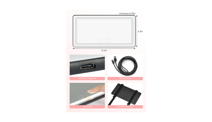 [Rechargeable Lithium Battery] Built-in 1500mAh lithium battery, which can be charged through the socket, computer, or mobile power. Dual type-c charge port design, comes with 10ft USB cable, long enough to free use the car visor mirror anywhere and anytime. It can last 8 hours if 100% brightness while always on mode