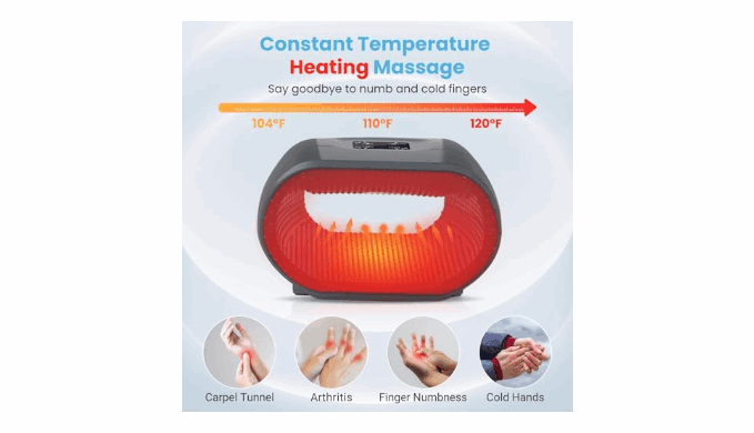 【Heated Therapeutic Relief】 Designed for arthritis and carpal tunnel relief, this hand massager delivers soothing warmth at 104°F/40°C or 120°F/47°C to boost circulation, reduce numbness, and warm cold hands. Heat enhances muscle relaxation and accelerates recovery.