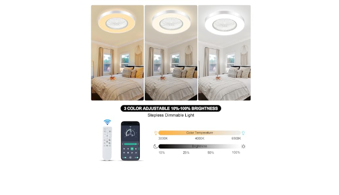 【3 Dimming Mode LED Lights】Our bladeless ceiling fan with lights offers three color temperatures-white, neutral, and warm, ranging from 2700K to 6500K. After using has a memory function. All settings are memorized when turning off lights with the remote control. Color temperature and brightness remain unchanged the next time you use the remote control turn on it.