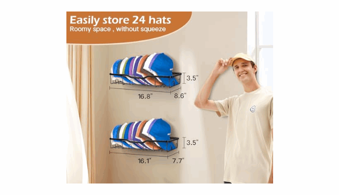 Assemble Easily:Wall-mounted design and install the hat storage for baseball caps with an electric drill, perfectly fit the strong screws onto the wall,the whole size is 16.8*8.6*3.5 inches(Large),16.1*7.7*3.5 inches(Middle)