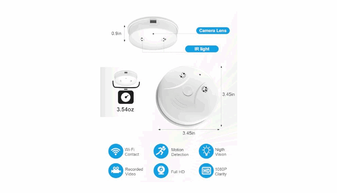 HD Security Camera: The 1080P clear real-time screen and wireless mini camera with 4 infrared lights greatly improve night vision. Even in a dark environment, you will be able to see details and protect your children, family and your personal property.This smoke detector model camera video only function.