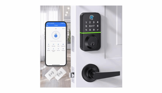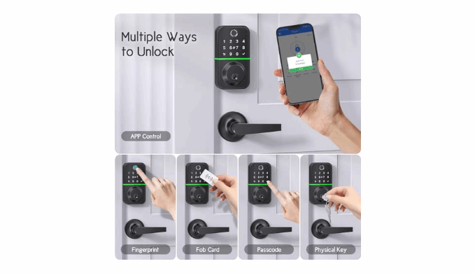 【Front Door Lock Set Keyless Entry】The keyless entry door lock deadbolt with handle set provides you multiple access ways to control: full APP control, fingerprint, passcode, key Fob, physical keys, Bluetooth, and Alexa voice control (Optionally, G2 Wifi Gateway required). Enjoy the convenience to use different methods to unlock the smart door lock.