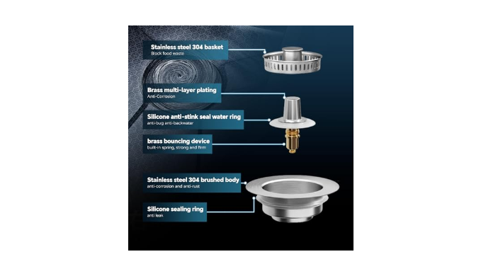 【Premium 304 Stainless Steel Construction】The Kitchen Sink Drain Strainer is crafted entirely from 304 stainless steel, with an internal copper bounce mechanism. This superior design outperforms other models that use plastic baskets and bounce mechanisms. The stainless steel sink stopper is exceptionally resistant to rust and corrosion, guaranteeing long-lasting durability without the need for replacement.