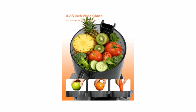 【Extra-Wide 4.35\" Feed Chute & Safety Lock】 Enjoy ultimate convenience and safety. Our large 4.35-inch chute allows you to juice whole apples, carrots, and pears without pre-cutting, saving you time and effort. The built-in safety feature automatically stops the machine when the lid is opened, ensuring complete peace of mind for every use.