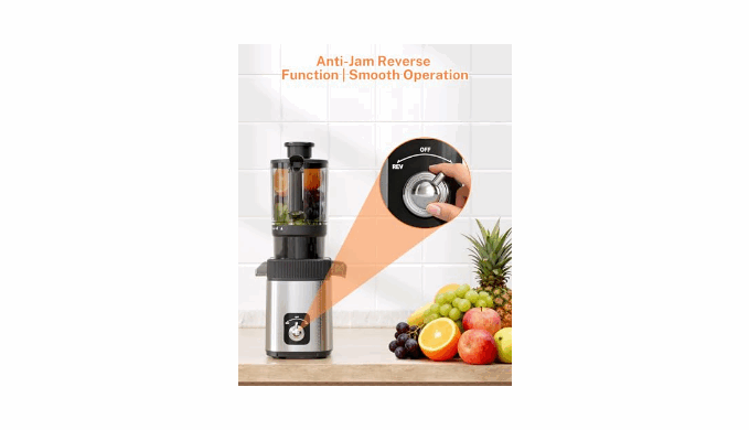【Simple Knob Control & Easy Cleaning】 Features an intuitive knob for one-touch operation and quick reverse function. If a blockage occurs, simply turn the knob to reverse—the auger spins backwards to clear jammed pulp, ensuring smooth, uninterrupted juicing. With only a few detachable parts and a included cleaning brush, assembly and cleanup are remarkably fast and simple.