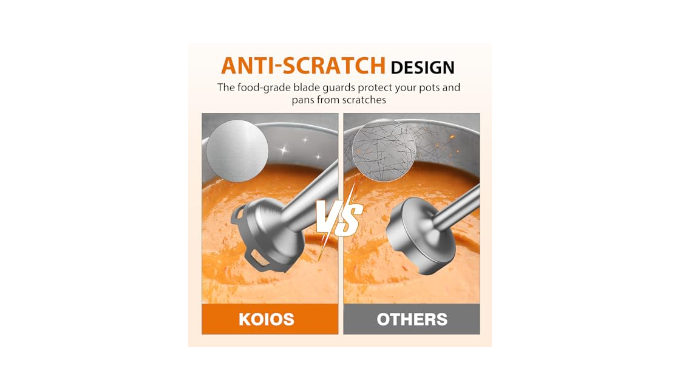 1000W Motor & 304 Stainless Steel 4-tip Blade: Compared with other 300-500W motors, upgraded KOIOS handheld blender is equipped with a 1000W all-copper motor, which is more powerful and has a stronger ability to crush food. With 304 food-grade stainless steel blades, this material has good oxidation resistance and high temperature resistance. Safe to use even in hot soup.