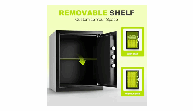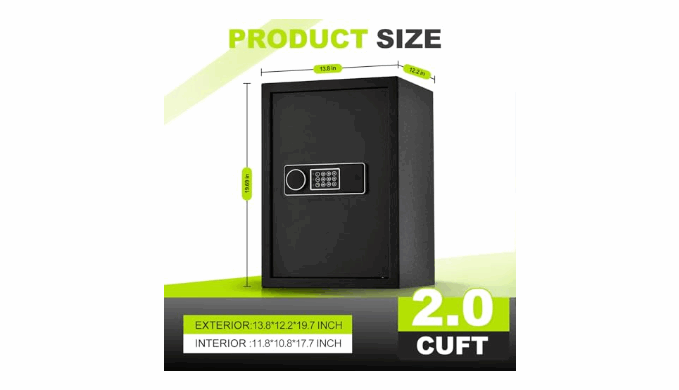 【2.0 CUFT Safe Box for Home & Office】Exterior: 12.2 x 13.8 x 19.7 inches (DxWxH); Interior: 11.4 x 13.0 x 18.9 inches (DxWxH). Maximize space in this safety box with the detachable steel shelf. Separate jewelry, cash, passports, devices, or remove shelves to store bulkier items like firearms or tablets.