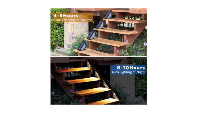 【Superior Performance】: The step light outdoor is equipped with an 800mAh lithium battery, 18 high-brightness LED beads, and the lumen of the light is as high as 80LM. The large solar panel(4.6x1.8 inches), ensures the charging efficiency of the solar lights for step. The solar step lights for outside offer 8-10H illumination for your garden and yard stair after a full 5-hour charge, without the need for any external electricity or wiring.((Please turn on the switch before charging. )