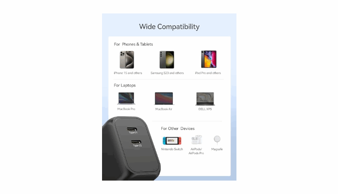 Charge 2 Devices at Once - Quickly charging your two devices at the same time via using this fast charger usb c (C1: 20W, C2: 20W ). Compatible with various fast charging protocols such as PD 3.0, PD2.0, QC 3.0, FCP, Apple 2.4A, PPS, and AFC, the 45w usb-c charger compatible for Galaxy S23, iPad Pro, iPhone 14 and more devices.