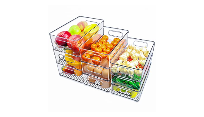 These organizer bins will make your cabinet storage easier, Ideal for storing your box drinks, fruit, vegetables, yogurts, food packets, canned foods, baby foods, boxed foods, condiments.