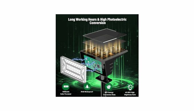 30% Increase in Solar Efficiency: Featuring advanced solar panels with 30% higher energy conversion efficiency compared to standard solar spotlights outdoor waterproof, these landscape lights maximize charging performance. The 120° adjustable solar panel optimizes sunlight capture throughout the day. Equipped with an intelligent light sensor , they automatically activate at dusk, switch off at dawn, and seamlessly enter charging mode (Green light flashing Charging ). Effortlessly cycle through lighting modes with a single button for hassle-free operation!
