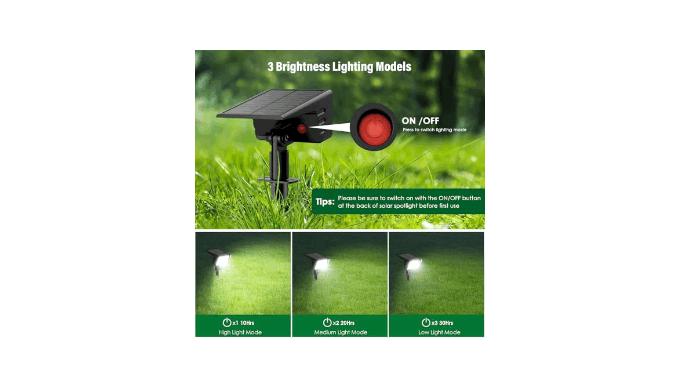 3 Brightness Lighting Modes: Easily switch between three light modes with just one button - High Light Mode (10 hours) / Medium Light Mode (20 hours) / Low Light Mode (30 hours). This solar spot lights outdoor provides clear, focused lighting even on the darkest nights, ideal for accentuating flagpoles, intricate sculptures, and enhancing garden landscapes