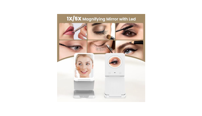 【 5X Magnifying Mirror with Lights 】-In addition to the regular 1x mirror, there is also a 5x lighted magnifying glass on the back of the mirror, which allows you to clearly see the details of your face without holding it and apply delicate makeup for eyeliner, eyebrow and lipstick. The angle and height can be adjusted at will for easy use