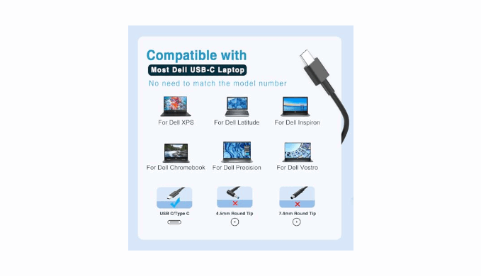 Universal Compatibility: perfect match most 65W 45W Dell USB-C laptop without error message popup, needn’t to check the model, widely compatible with Dell XPS 13 9305 XPS 12 9250, Latitude 9520 7440 5540 5530 5520 5480 5440 5431 5430 5420 5400 5340 5330 5320 3550 3440 3330, Latitude 12 13 14 Rugged 7230 7220 5430, Inspiron 13 14 15 16 5000 7000 series, Chromebook 14 11, Precision 3580 3570 3560 3480 3470, Alienware X14...