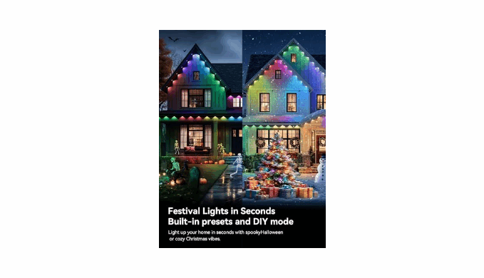 【Smart Outdoor Lights】Control your eave lights with ease via app or remote—adjust brightness, choose from millions of colors, set timers and create custom modes for your permanent Christmas lights outdoor or daily ambiance. Activate music sync to enjoy dynamic lighting that moves with your rhythm.