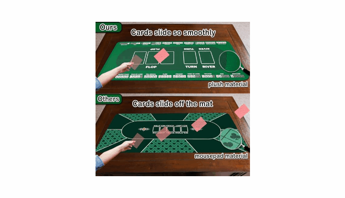 DURABLE THICKENED POKER MAT LENGAMPLAY stitched edges poker table mat made of professional casino table plush cloth and non-slip rubber bottom, its weight keeps it securely in place. LENGAMPLAY poker topper has a nice smooth surface so the cards can slide along well
