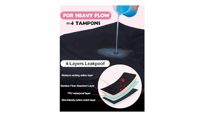 Leak-Proof Protection: These period shorts feature a comprehensive 4-layer system: a penetration layer, safe fiber absorption layer, TPU waterproof layer, and a skin-friendly cotton crotch layer, ensuring superior leak protection. With absorbency equivalent to 3-4 regular tampons, they are perfect for medium to light flow days and can be used alongside tampons, menstrual cups, or pads for added security.