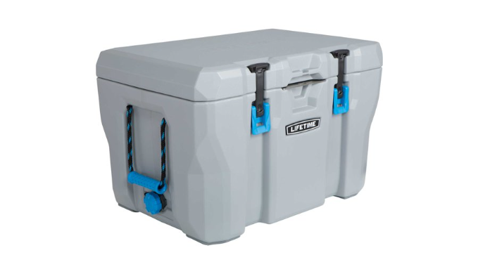 Lifetime Cooler – Lifetime 55 quart blow molded cooler features (2) rope handles with blue injection molded grips, (4) feet that are serviceable, drain spout with hose hook up, bottle opener, holes for a lock (lock not included), (2) cam latches that secure lid when shut and up to a 7-day ice retention. Comes with a 5-year limited warranty. High performance hard-sided cooler.