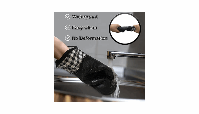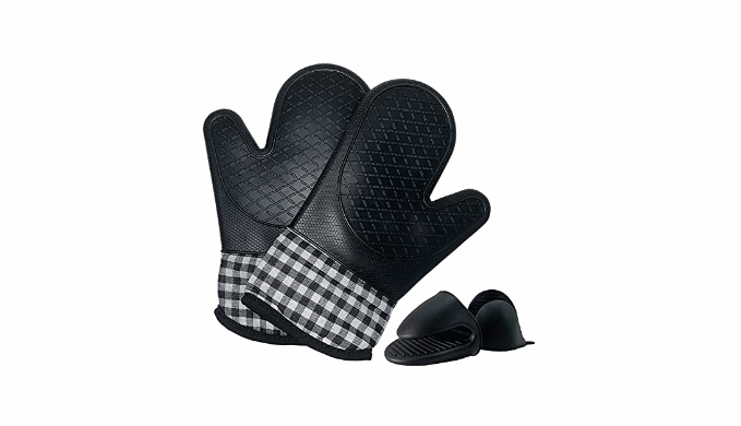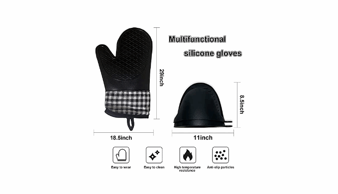 4 Piece Kitchen Accessory Set: 2pcs non-slip surface silicone kitchen oven gloves , 2pcsTextured non-slip grip our domestic kitchen oven gloves are widely used for cooking, grilling, microwaving, cooking soup and more. It brings better protection for you and your family. Waterproof, keeps you safe from steam burns and makes your cooking time easy and safe