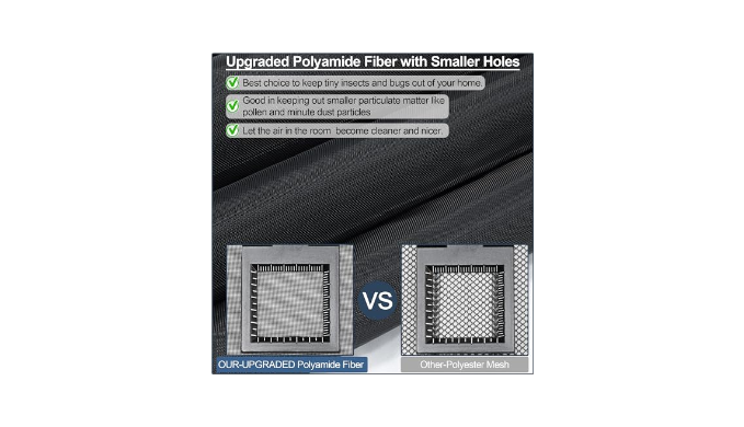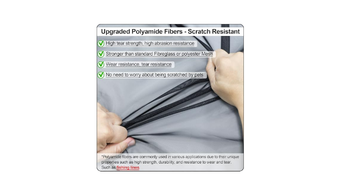 Upgraded Polyamide fiber Mesh- Scratch Resistant:Made of Polyamide fibers Which are commonly used in various applications due to their unique properties such as high strength, durability, and resistance to wear and tear.Such as fishing lines.Polyamide fiber Mesh is Much stronger than ordinary polyester or fiberglass screen door mesh. It is sturdy, tear-proof, and scratch-proof, so there is no need to worry that the screen door magnets will be broken in a short time.
