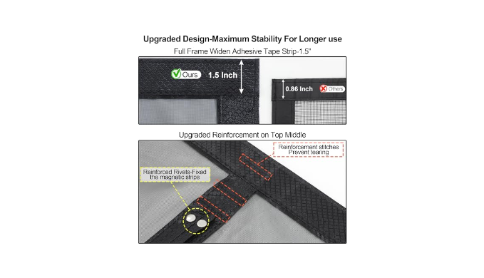 Double Reinforcement:Full Frame Widen Adhesive Tap Strip-1.5 Inch,make sure maximum stability for longer use.Unique Reinforced Line in Top Middle,Protects the top middle of the patio screen door for tearing