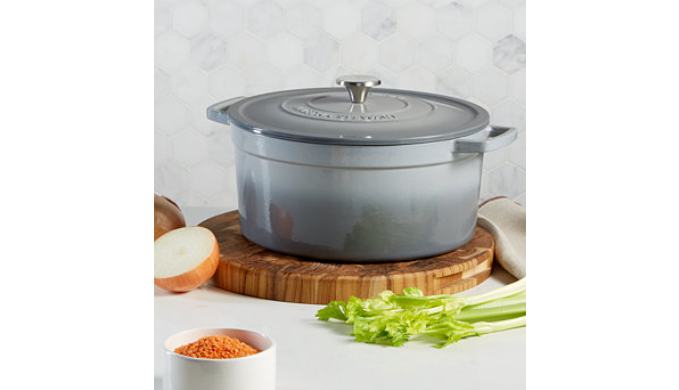 Ideal for baking or slow-cooking your favorite dishes, this family-sized 8-quart Round Dutch Oven from Martha Stewart Collection moves easily from oven to table while providing lasting beauty with your choice of colored exteriors. Heavy enamel-on-cast iron construction distributes heat evenly while locking in moisture.