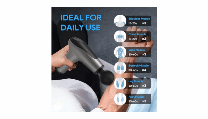 What’ more, it brings super silent when massaging, you can enjoy your relaxation time. You can actually use this portable massage gun in your office, at the gym, in the hotel lobby, or in the airport without pissing off your colleagues or the bystanders because the working dB only about 35dB - 45dB.