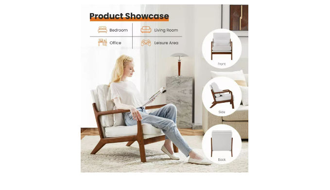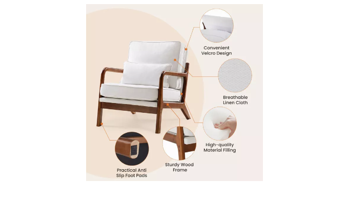 This Modern Linen Fabric Upholstered Wood Frame Lounge Comfy Reading Accent Chair with Lumbar Pillow is the perfect stylish upgrade for your home. Crafted from high-quality linen and solid wood, this mid-century chair combines modern design with stability and reliability. It is an essential piece of furniture that adds a trendy touch to any room. The chair features removable pillow covers with a zipper design, making it easy to clean the backrest and cushions without damaging the padding. The discrete zipper not only maintains the chair’s aesthetics but also enhances the convenience of cleaning. Additionally, the backrest is attached to the lounge armchair structure with Velcro, allowing for effortless removal and secure fastening for maximum comfort. Designed with ergonomic lines that flawlessly match the curves of the sitting person, this accent chair provides ultimate comfort. The attached lumbar pillow offers extra support for the waist and spine, promoting deep relaxation after a long day. Non-slip feet pads ensure stability and safety, allowing you to place the chair in any room of your home and move it around with ease. Whether in the balcony, bedroom, or living room, this chair adapts to any setting, providing unrestricted movement and comfort for all-day relaxation.