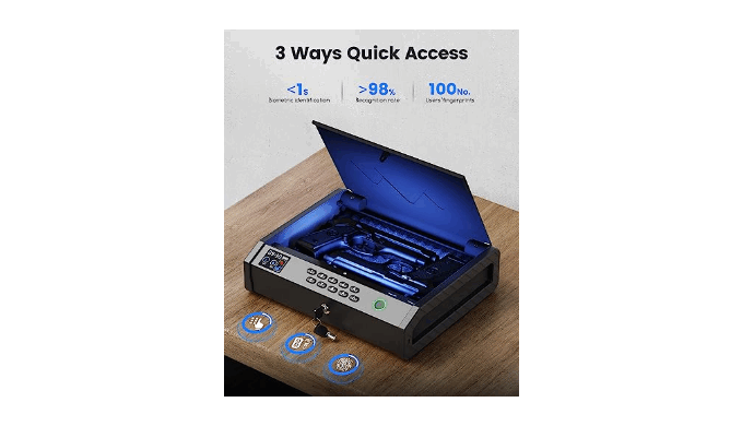 3 Ways Access: The handgun safe is easy to set up, utilizes a set tool pin, and you simply engage options by putting a pin tool in each mounted hole. you can set fingerprints (up to 100), codes(up to 10) or 2 backup keys.The fingerprint access allows for reaching your firearms within 1s.