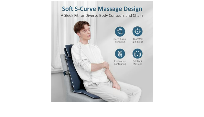 Tailored Comfort with S-Curve Design: The innovative soft S-Curve design adapts to any body contour and chair, offering a personalized full or spot shiatsu back massage. Effectively relieve back pain and muscle stiffness for a perfectly relaxing experience anywhere