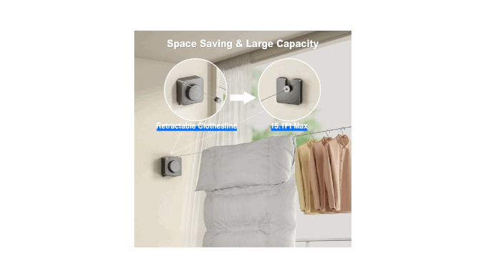 【Large Capacity & Heavy Duty】The longest length of this line is 15.1 feet, and there is enough space to hang your clothes, socks, quilts, etc. This Clothesline can also hold a maximum weight of 40 pounds, you don\'t need to worry about hanging clothes too heavy to cause the line to fall.