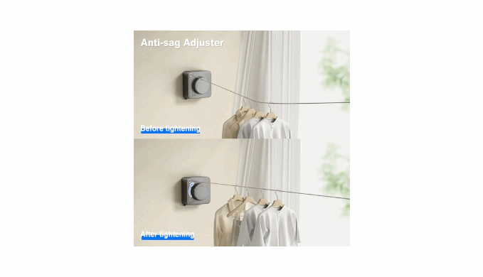 【Non-Sagging Design】The Retractable Clothesline is a non-sagging design, there is a locking device and a rotating tightenable device, when you hang a lot of clothes resulting in sagging, keep the locked state and then rotate to tighten the line can solve the problem of sagging. Such a very careful design is not available in others\' clotheslines.