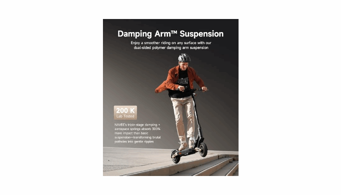 -Automotive-Grade Quadruple Suspension: Powered by the Advanced Damping Arm System, this scooter’s dual-sided polymer damping arm suspension provides exceptional stability and comfort. Absorbing shocks and vibrations, it ensures a smooth ride on any terrain—city streets or rough trails. Smarter, smoother, and built for every adventure.