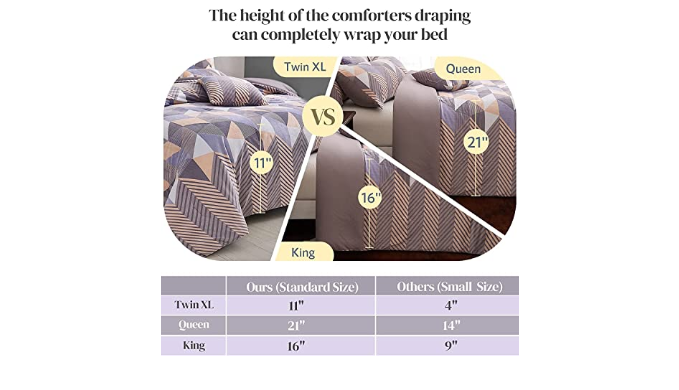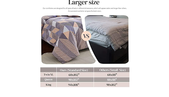 MULTIPLE SIZE OPTIONS: Our standard size flannel comforter is longer and wider than the same type of product on the market (Standard Size VS Small Size). Queen-size comforter 90x102\" Vs others 88x88”; King size comforter 94x108\" Vs others 90x102\"; Especially Twin XL size comforter, 68x102\" much longer than others 68x88\". More sizes give you more choices and experience.