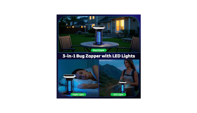 3-in-1 Bug Zapper with LED Lights & Auto/SOS Modes: This versatile device serves as a fly zapper, LED light, and emergency SOS tool. Use the mosquito lamp as a dimmable nightlight, camping lantern, or yard solar lights outdoor. It features an intelligent dusk to dawn sensor that automatically activates the fly killer based on surrounding light conditions. In emergencies, switch to SOS mode for a flashing light signal, ensuring safety during power outages or outdoor adventures