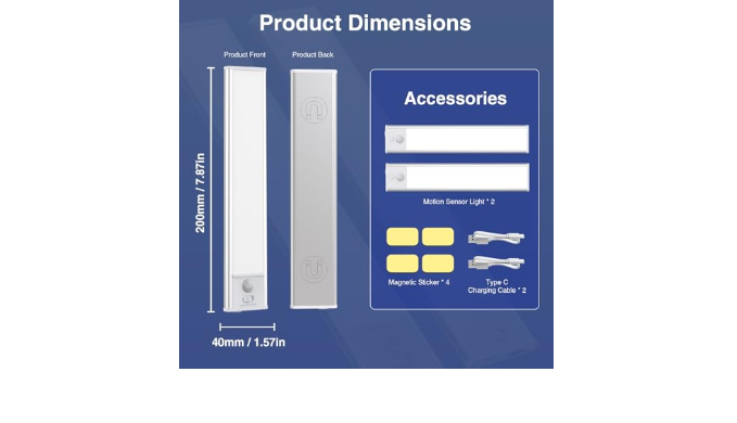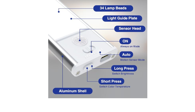 Motion Sensor Activation In Dark: Our 8 inch 34 Led cabinet lights feature advanced motion sensors that automatically illuminate when detecting movement at night, providing you with a convenient and safe lighting solution