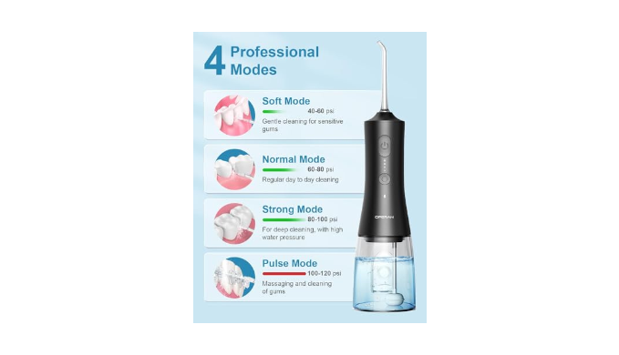 4 Professional Modes and Nozzles: The water flossers for teeth has four cleaning intensities: gentle, normal, pulse and powerful. You can choose between a gentle rinse mode to avoid excessive water pressure that can cause your gums to bleed, and a powerful mode that rinses your gums with strong water pressure. Use the 360° rotating, tonsil stone, plaque or tongue cleaner nozzle for a professional cleaning experience. This water dental flosser is designed for braces, bridges and orthodontic