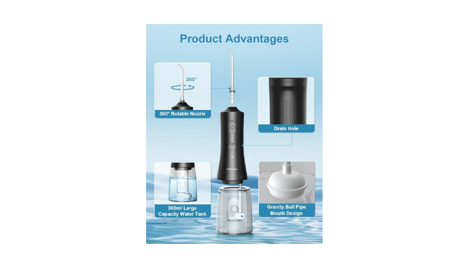 Large Capacity Water Tank and IPX7 Waterproof:The 300ml flosser tank is designed to meet the needs of a complete oral cleaning. The gravity ball design of the flosser tube hole utilizes the water in the tank more efficiently. Open tank and removable design for easy cleaning. In addition, this portable water dental flosser is waterproof to IPX7 and the rinse features a double seal ring to prevent leaks, so you can use it in the bath or shower with confidence