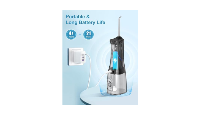 Long Battery Life and Portable Design:This cordless water dental flosser is powered by a powerful eco-friendly battery, the USB rechargeable water dental flosser lasts up to 30 days on a single charge. This dental water flosser is perfect for home, travel, office or business use. This electric flosser is compatible with USB-A and Type-C ports or devices with USB ports, such as power banks, computers.Note: USB cable included, charging adapter not included