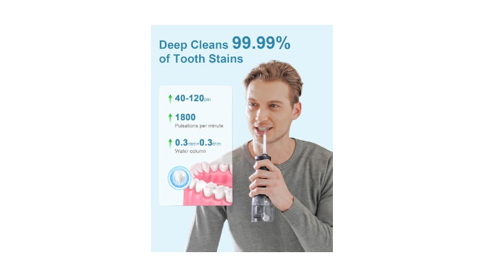 Achieve a Deep Clean and Improve Gum Health: This cordless water dental flosser has a water pressure of 40-120 PSI and 1800 high-pressure water pulses per minute that cleans 99.99% of stains, food debris, and plaque to keep your mouth fresh and whiten your teeth. The water dental flosser cleans teeth 5 times better than traditional water dental flosser and can replace traditional floss picks with less damage to gums and teeth