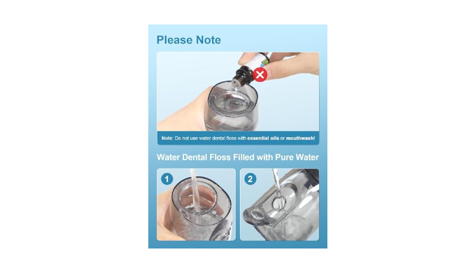 Please keep in mind the following precautions when using the water dental flosser:1. Avoid using essential oils as they can clog the conduit, damage the body, and corrode the water main board, affecting the water dental flosser\\\'s functionality.2. To prevent water from splashing, partially close your mouth during dental rinsing.3. Ensure that the charging port cover is securely closed to Ideal it from water and prevent charging issues such as inability to charge or slow charging