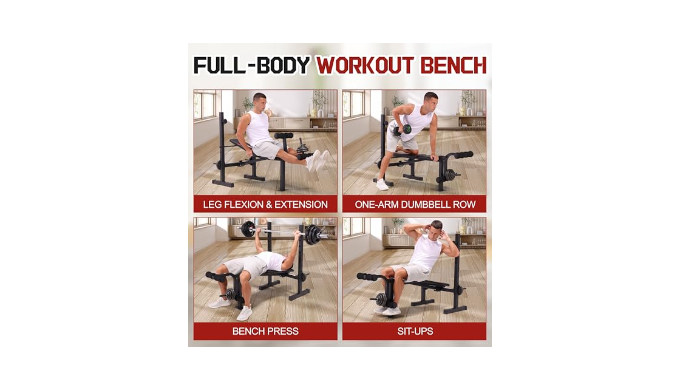 【9 in 1 Bench Press】This OPPSDECOR all-in-one weight bench includes an adjustable weight bench, a heavy-duty barbell rack and a functional leg developer, allowing you to do lever bench press, one-arm dumbbell row, dumbbell press, leg curl & extension, sit-ups and more. It\'s worth mentioning that plates and barbells are not included.