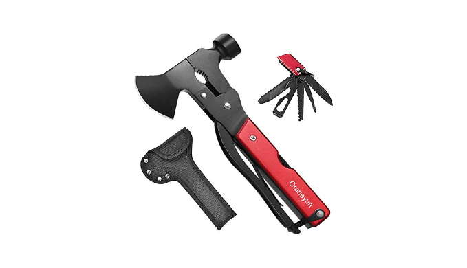 【Camping Multitool Tools Kit】Contains 16 different multi tool includes: Axe, Hammer, Flat Jaw Plie, Wire Cutter, Bottle Opener, Fish Descaler, File, Slotted Screwdriver, Knife, Assorted Hex Wrench, Wood Saw, Phillips Screwdriver and more tools. The bottom is equipped with a safety lock. When using a hatchet and hammer, the rest parts are firmly fixed in position to prevent accidental injury.