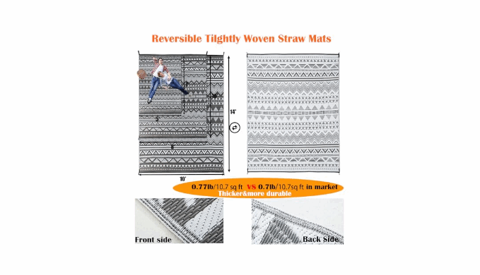 [Stain-Resistant & Easy to Clean Waterproof Outdoor Rug ] This plastic straw wove rug resists stains and cleans effortlessly—simply hose off or wipe down. Our plastic Outdoor rug waterproof dries faster than traditional carpets, making it pet-friendly and great for kids’ play areas, picnics, or high-traffic spaces.