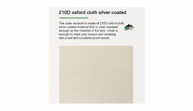 The outer account is made of 210D oxford cloth silver-coated material that is wear-resistant enough as the material of the tent, which is enough to meet your leisure and camping rain-proof and sunshine-proof needs.