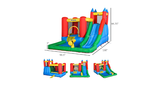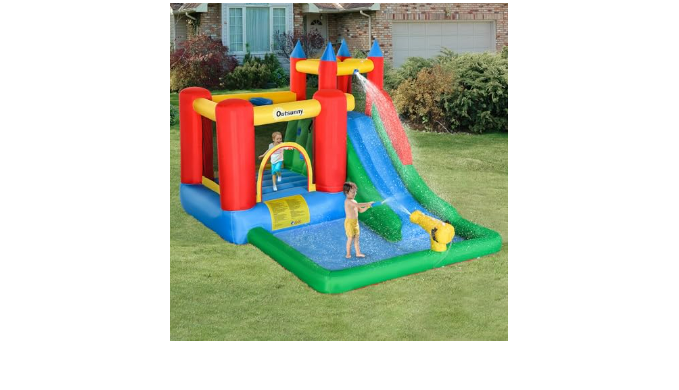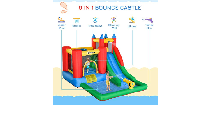 Water Play: The inflatable water slide in this multi-activity play house lets kids ride down to a splash zone in the pool where a water cannon offers a classic and lovable favorite. It is big enough to accommodate 4 children aged 3-8 at the same time.