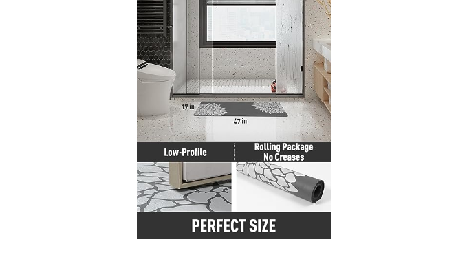 【Choose the Right Size&Wide Use】 17”x47” for half baths or bathrooms with a sink and toilet. 17”x57” long bath mat suits larger spaces like master bathrooms. For double vanities or lengthwise coverage in small bathrooms, oversized large bath mat 17”x67” is the perfect fit. Bathroom rug runner can use in bathroom, laundry room, doorway, kitchen, bedside.